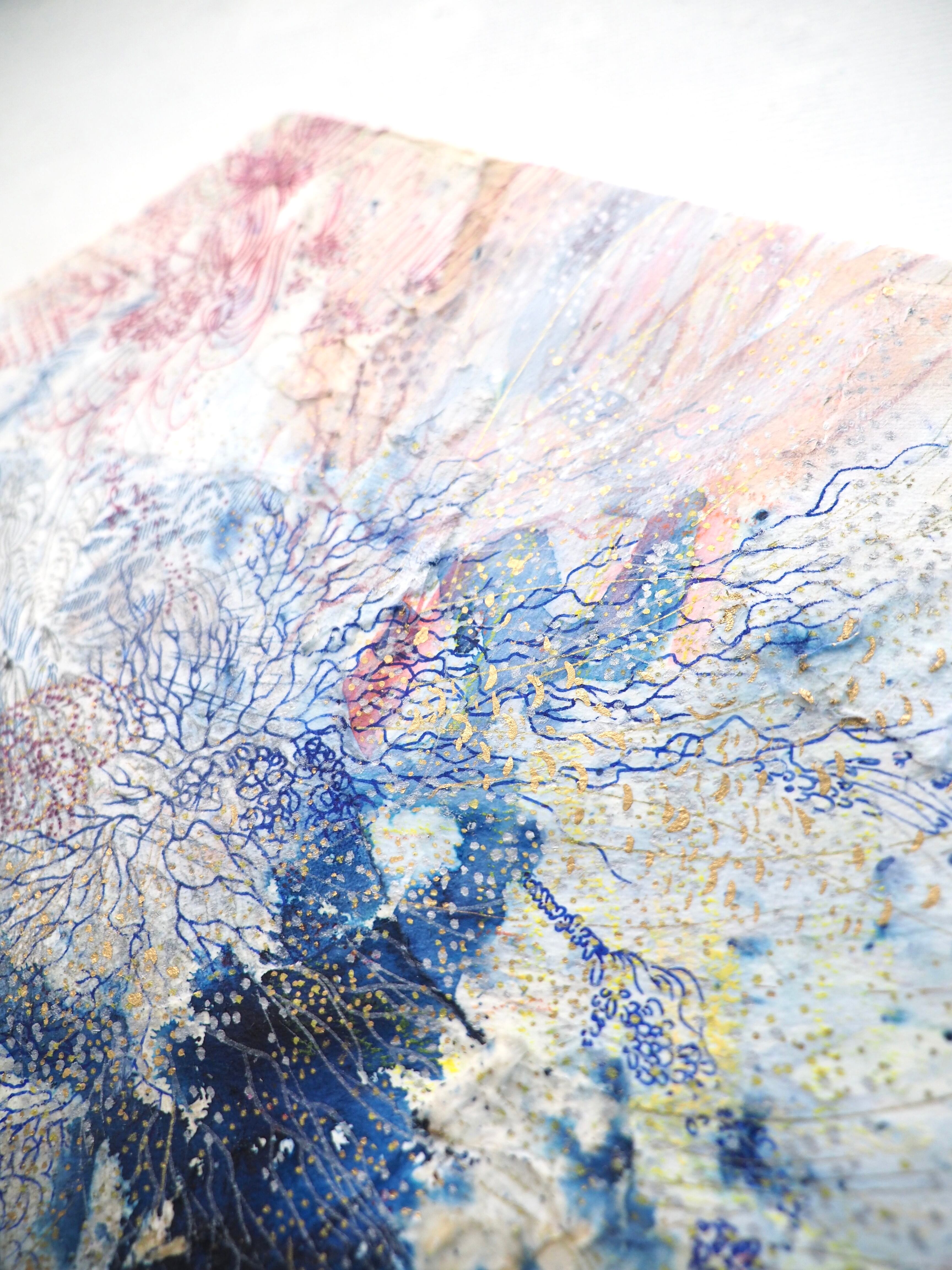 水彩インク、水彩色鉛筆、川、砂、葉、鉛筆、玉ねぎの皮、アクリルガッシュ、ペン、オイルパステル、藍、水彩紙、キャンバス