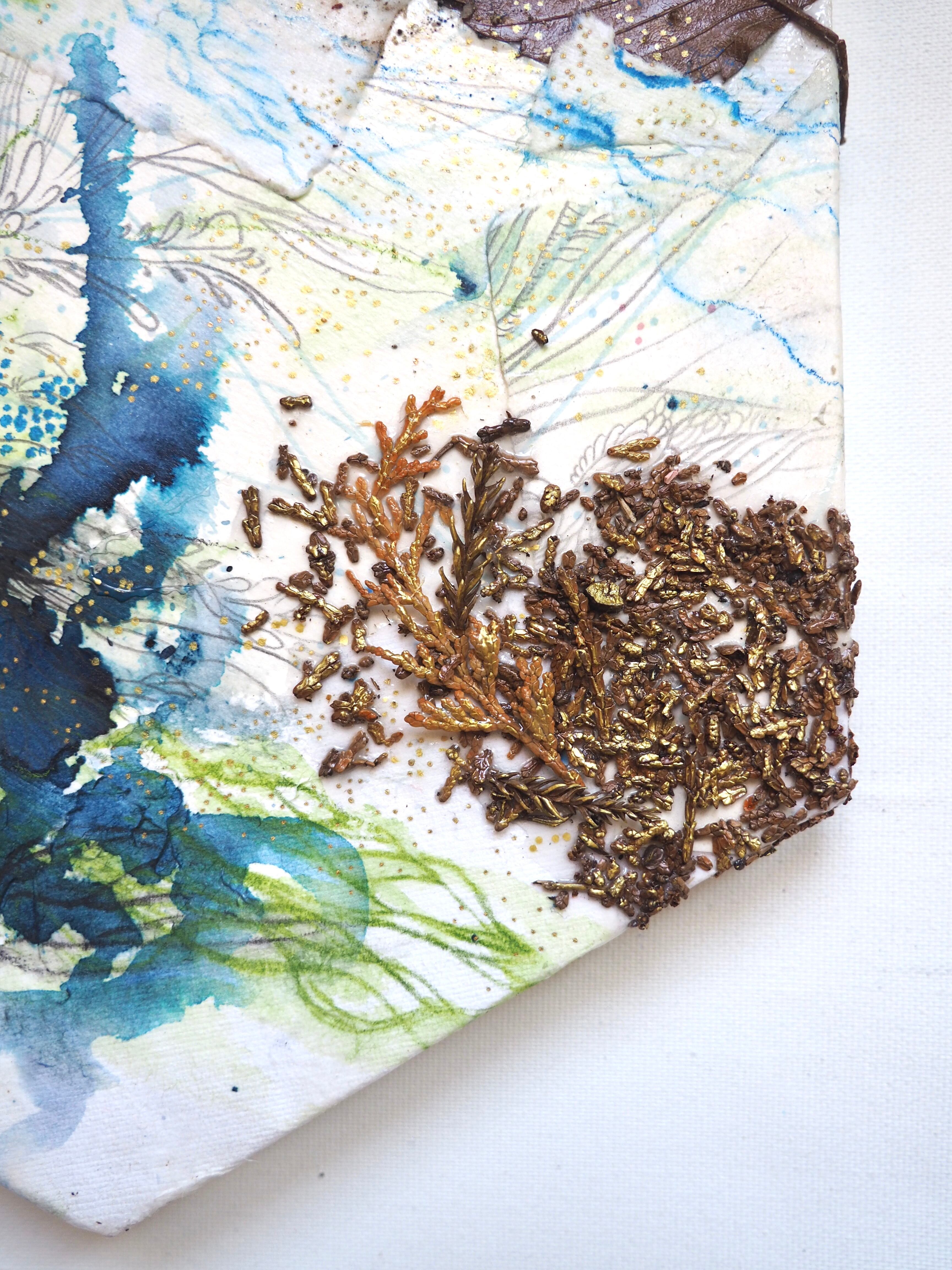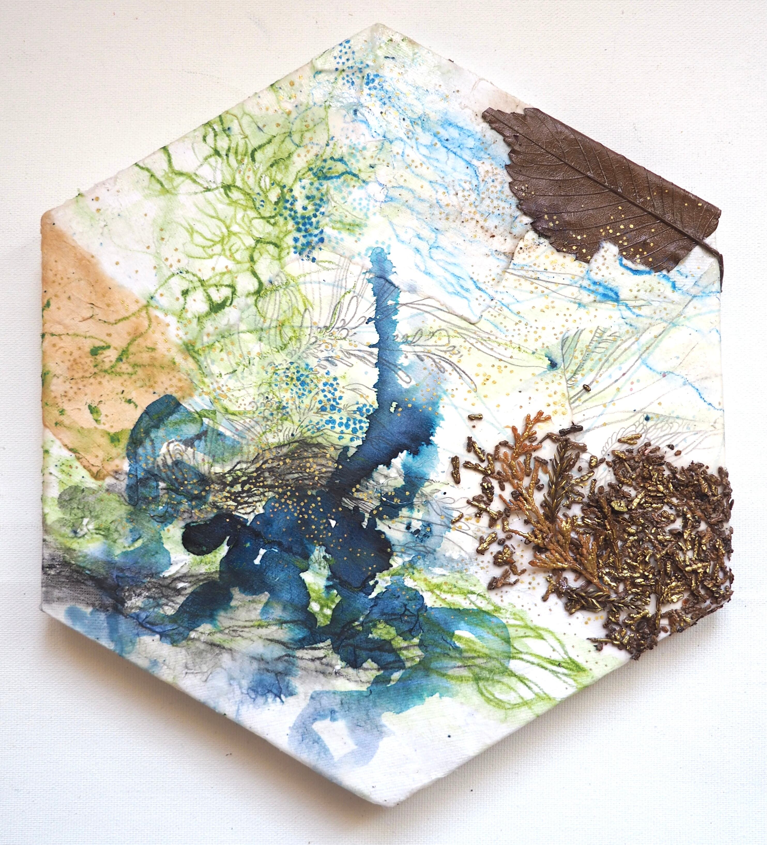 水彩インク、水彩色鉛筆、川、砂、葉、鉛筆、玉ねぎの皮、アクリルガッシュ、ペン、オイルパステル、藍、水彩紙、キャンバス