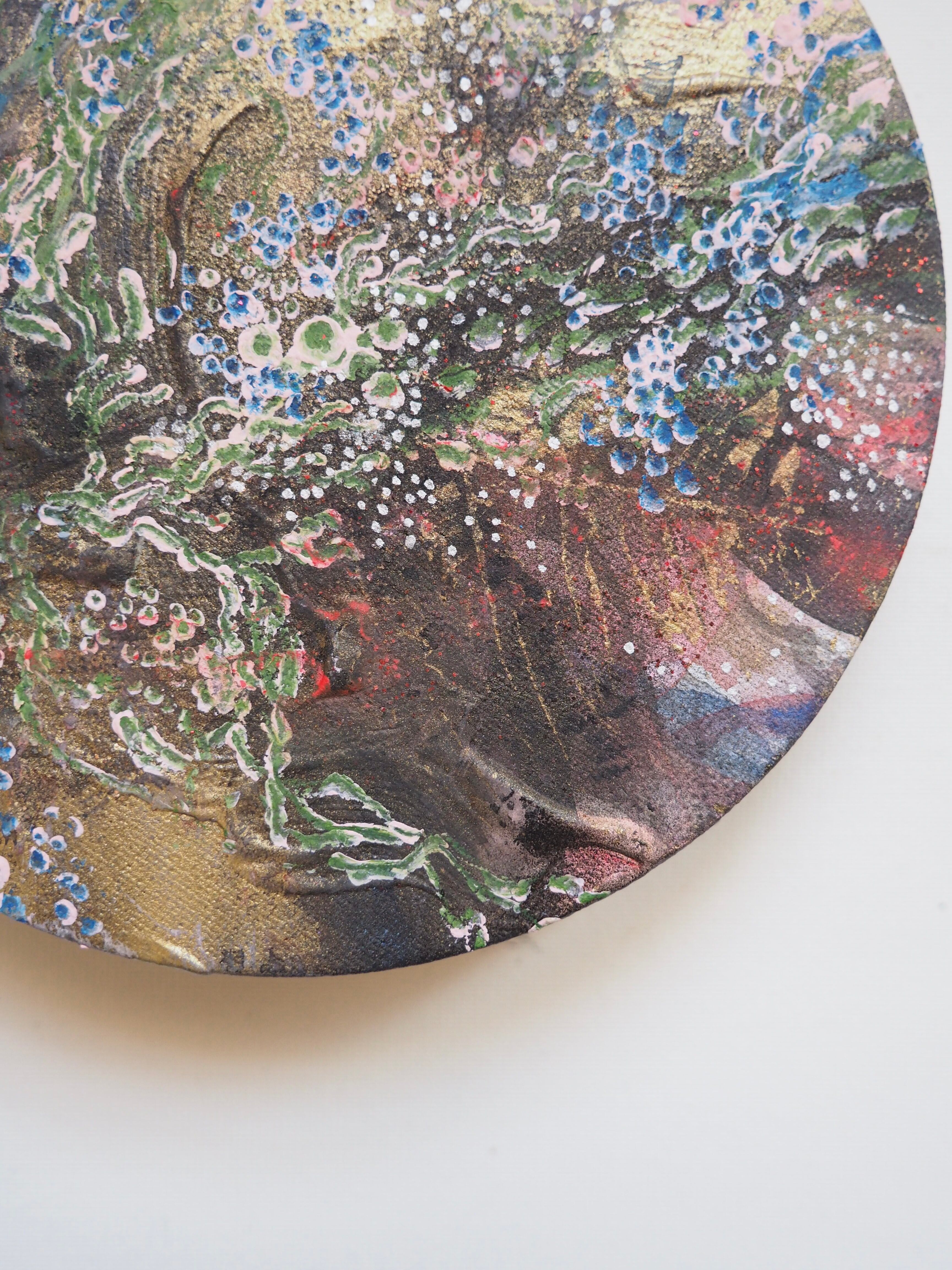 Φ150mm 水彩インク、墨、木炭、雨水、葉、珪藻土、漆喰、スプレーペイント、アクリルガッシュ、水彩色鉛筆、ペン、キャンバス