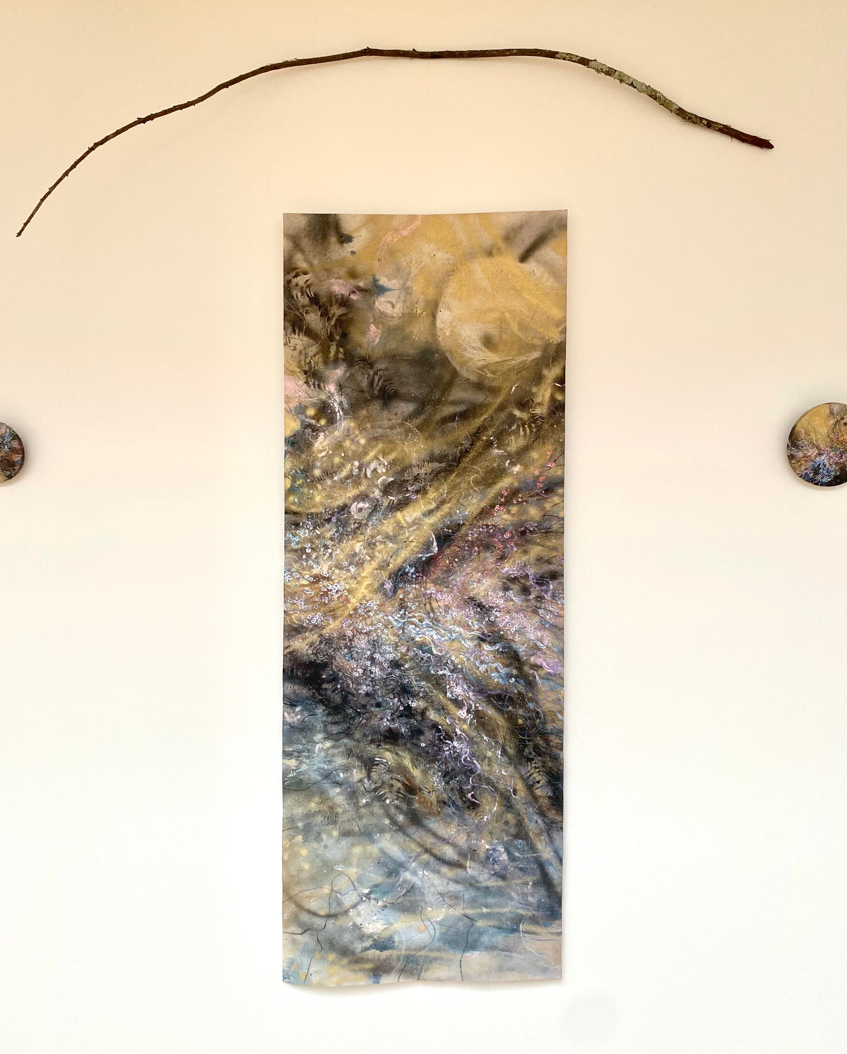 スプレーペイント、葉、枝、漆喰、木炭、珪藻土、アクリルガッシュ、水彩インク、オイルパステル、ペン、キャンバス布