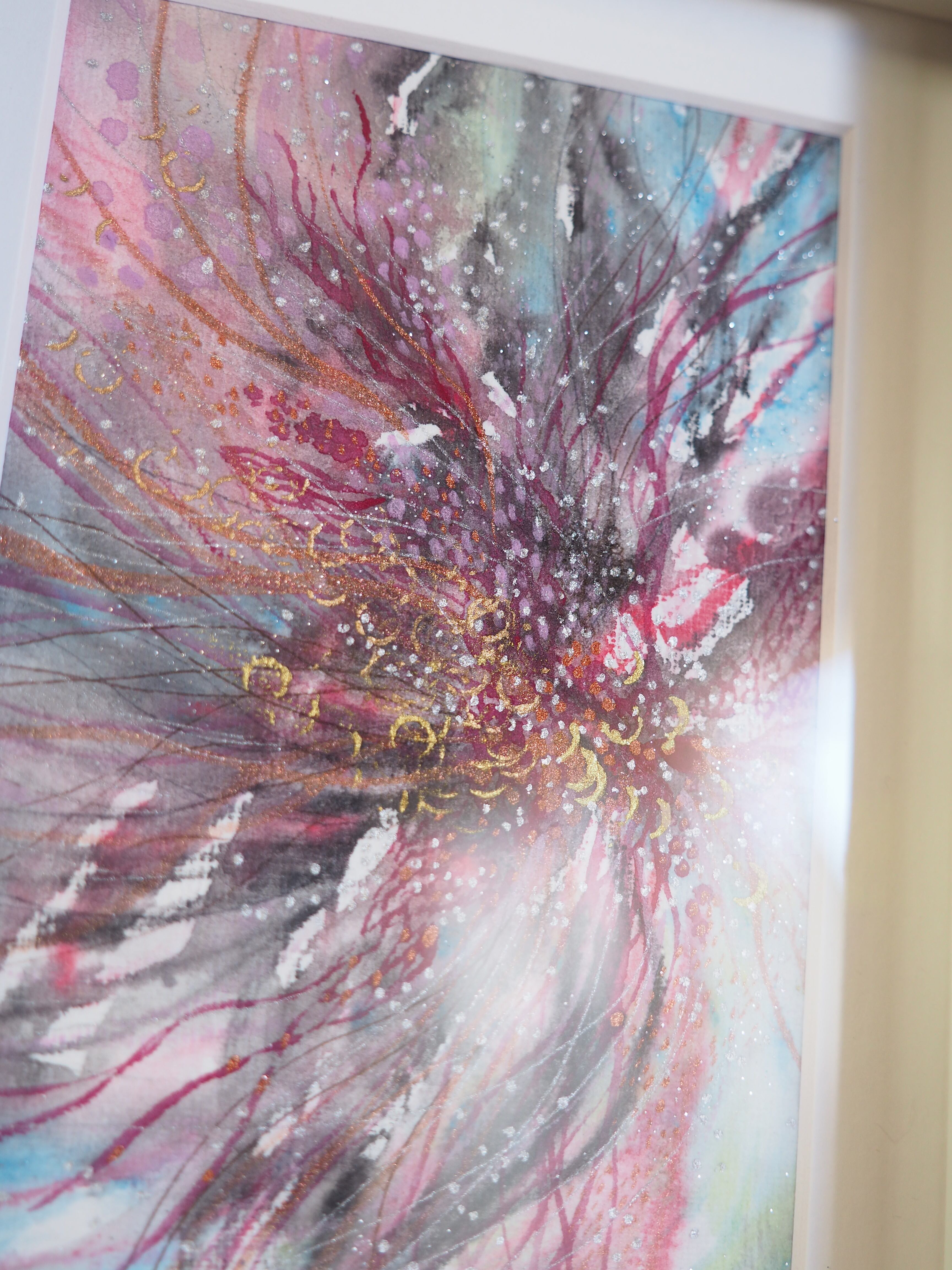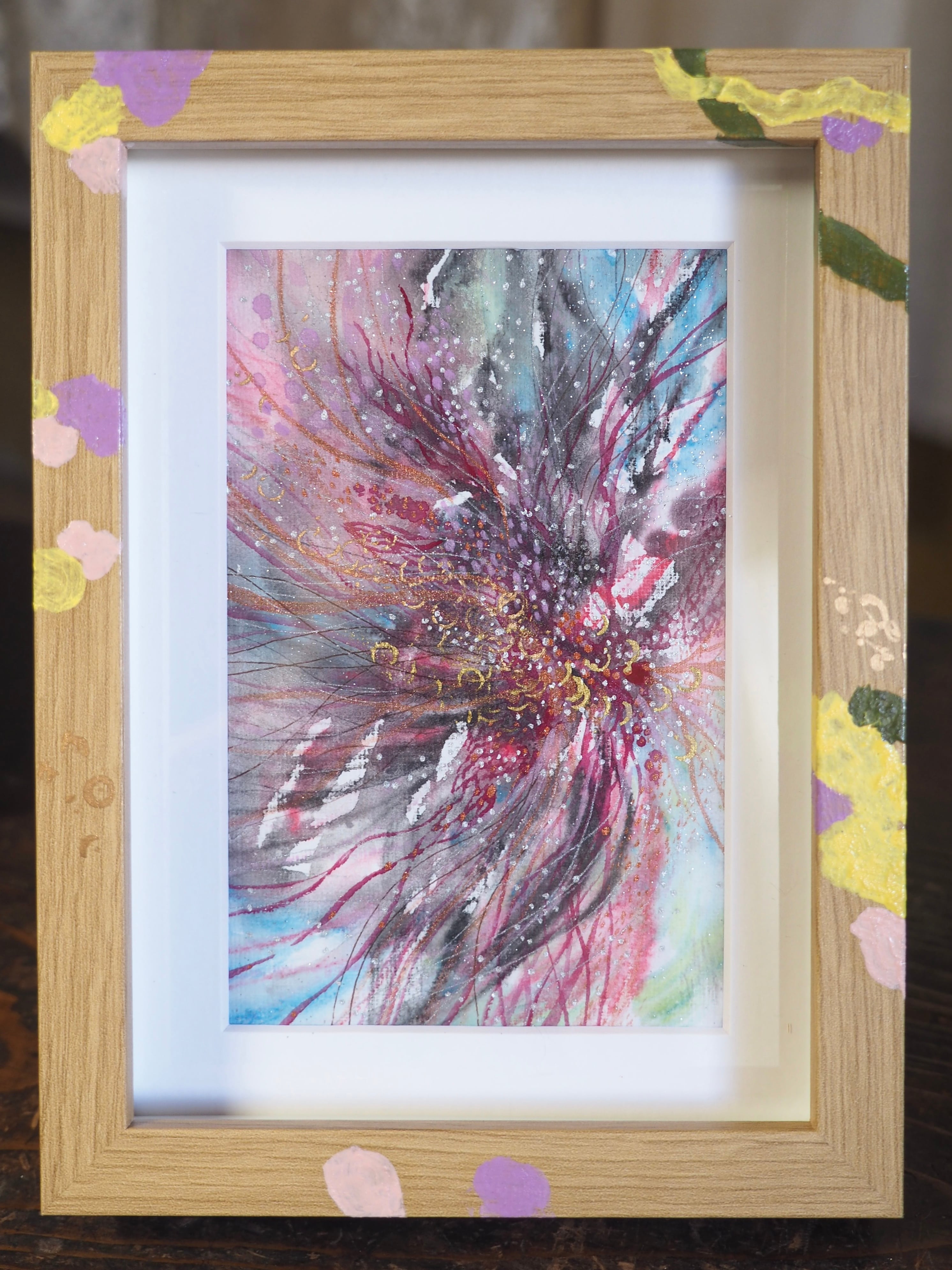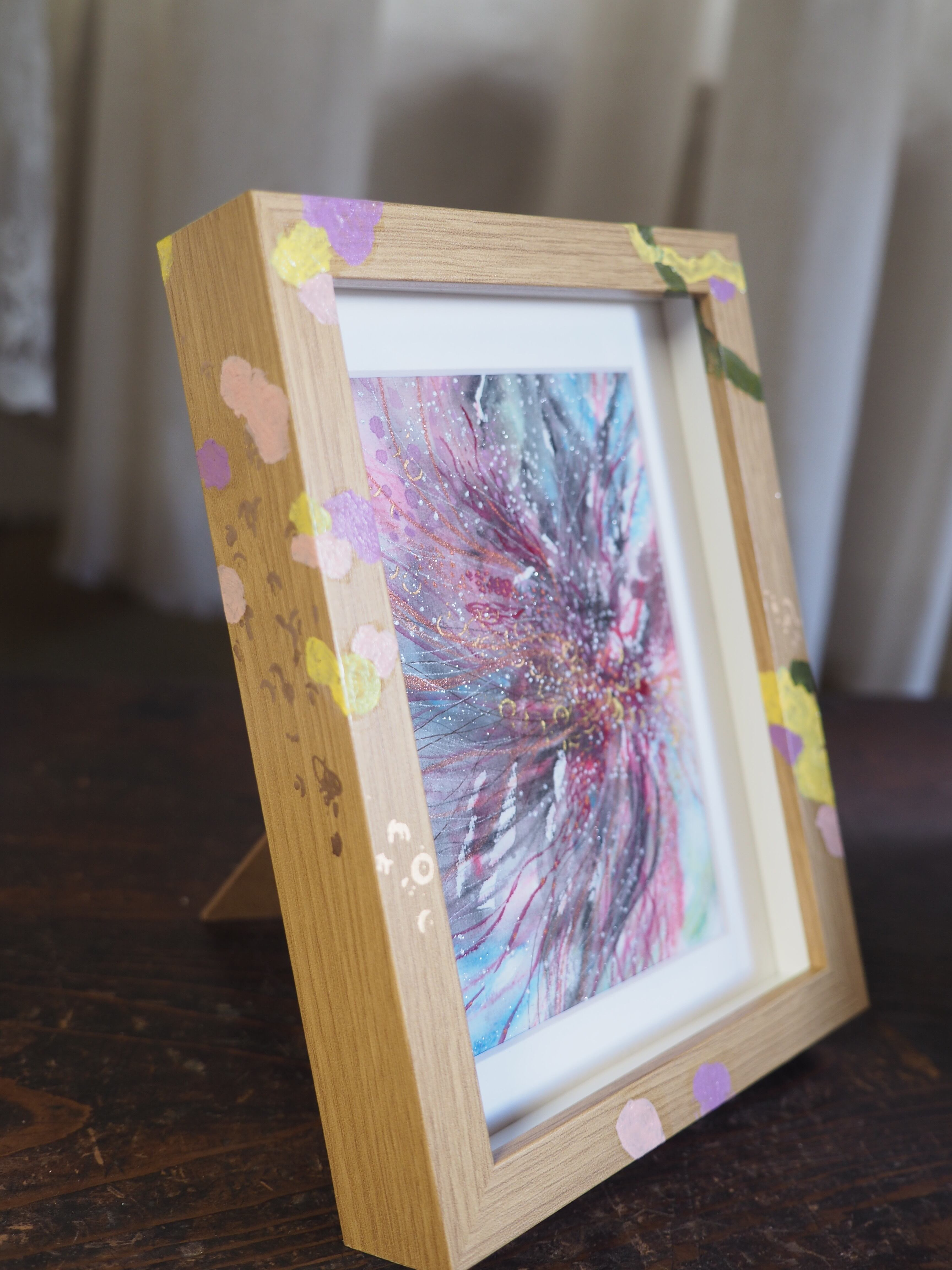 水彩紙、水彩色鉛筆、アクリルガッシュ、木炭、ペン、額縁