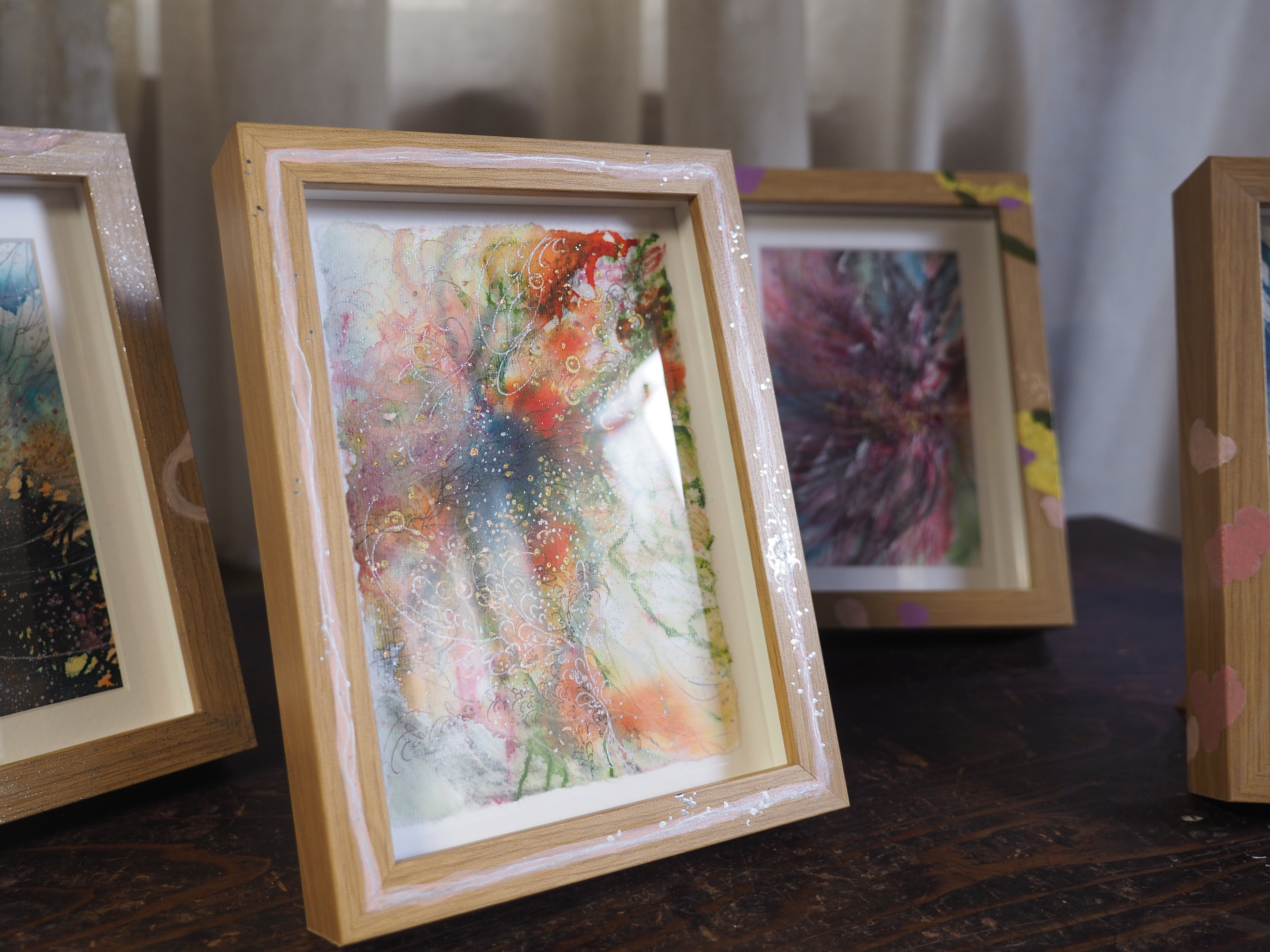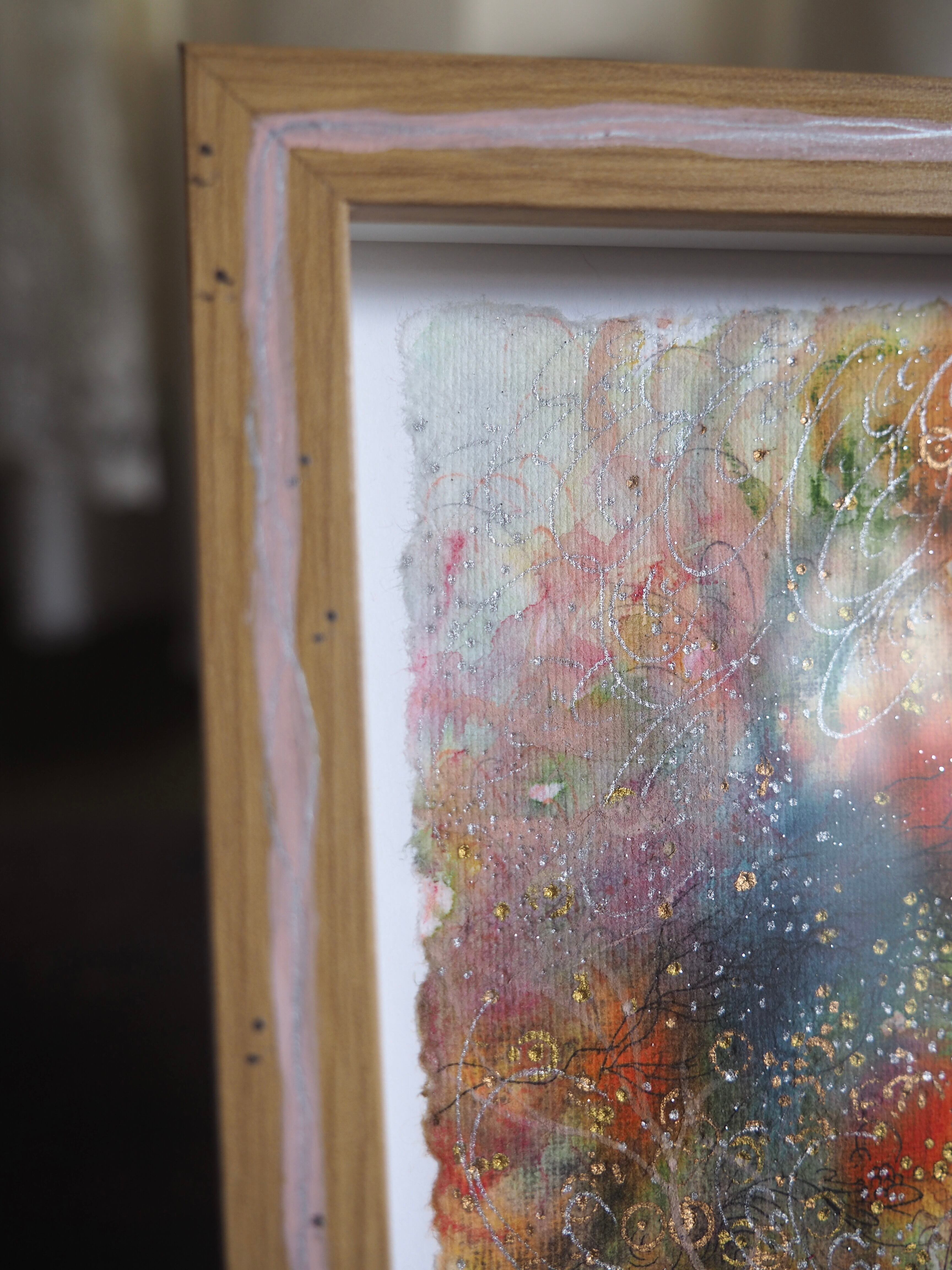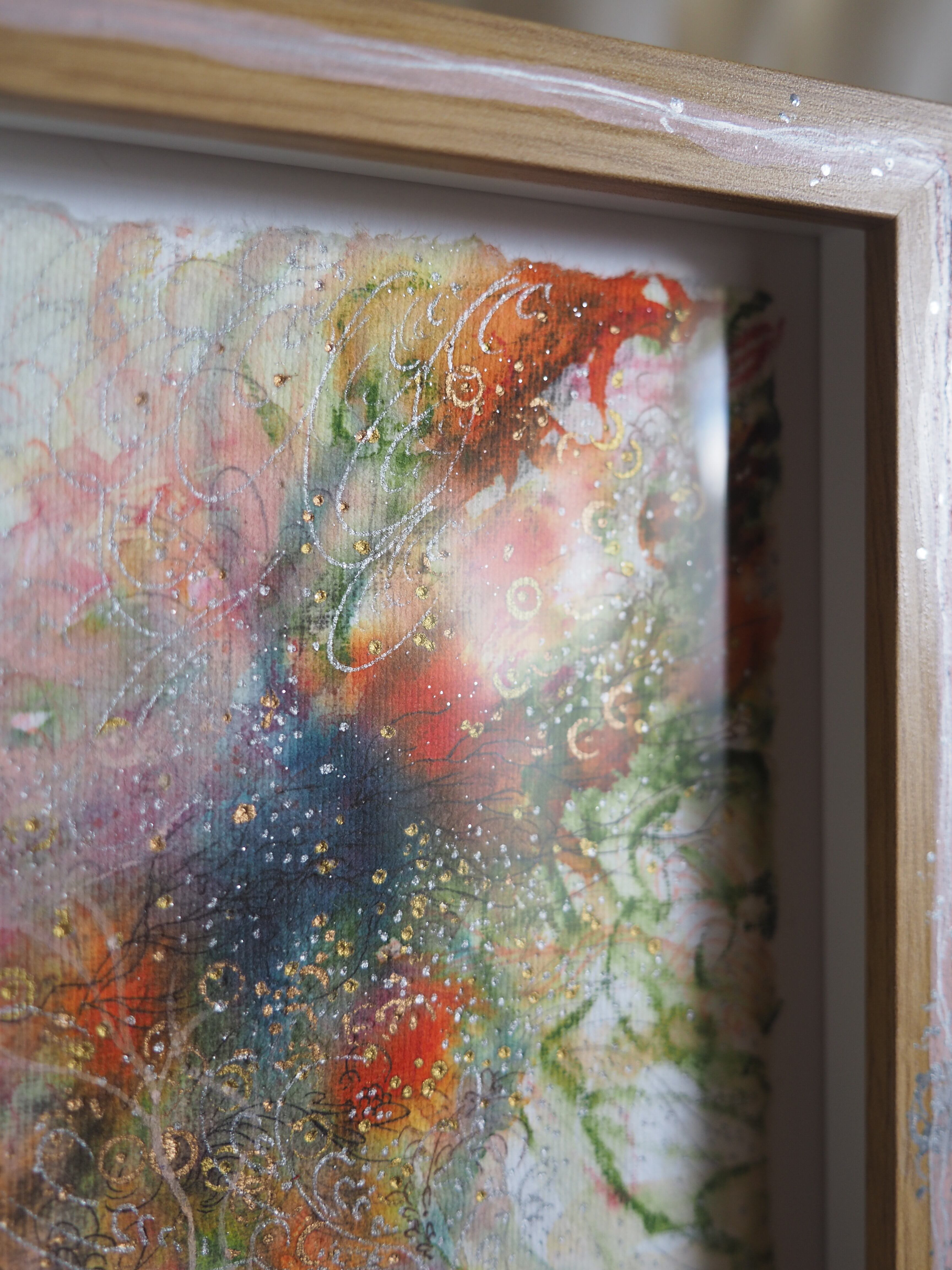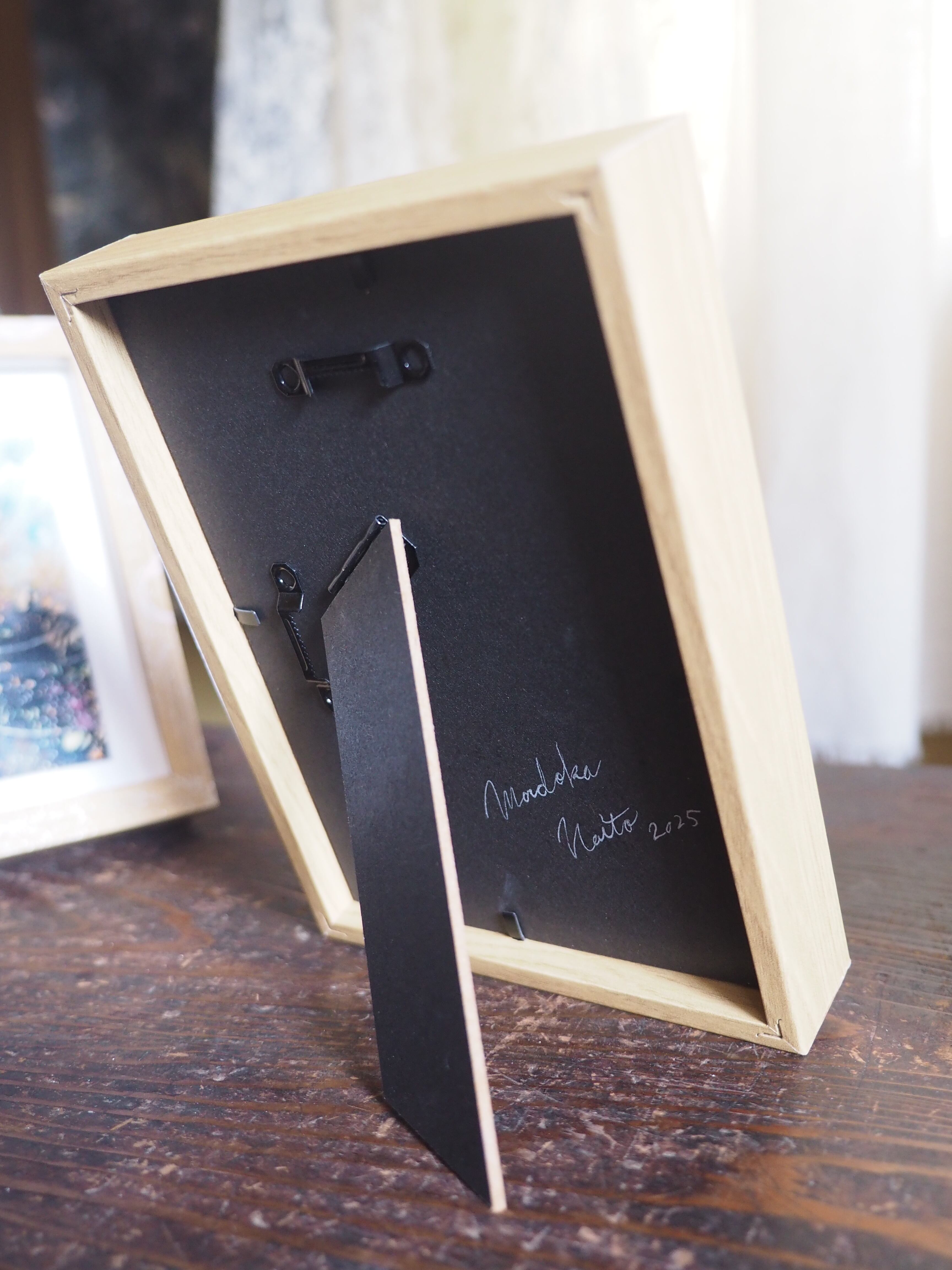 水彩紙、水彩色鉛筆、アクリルガッシュ、木炭、ペン、額縁