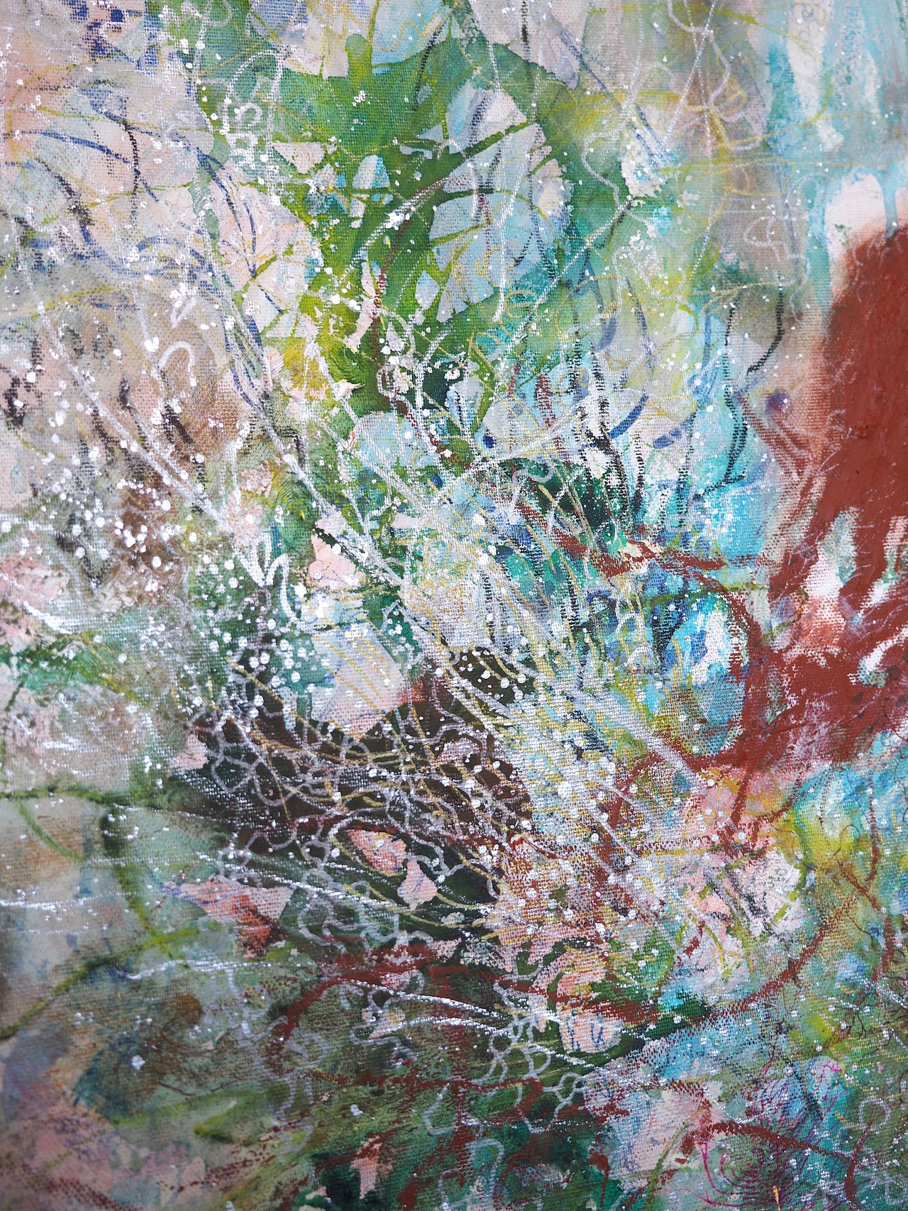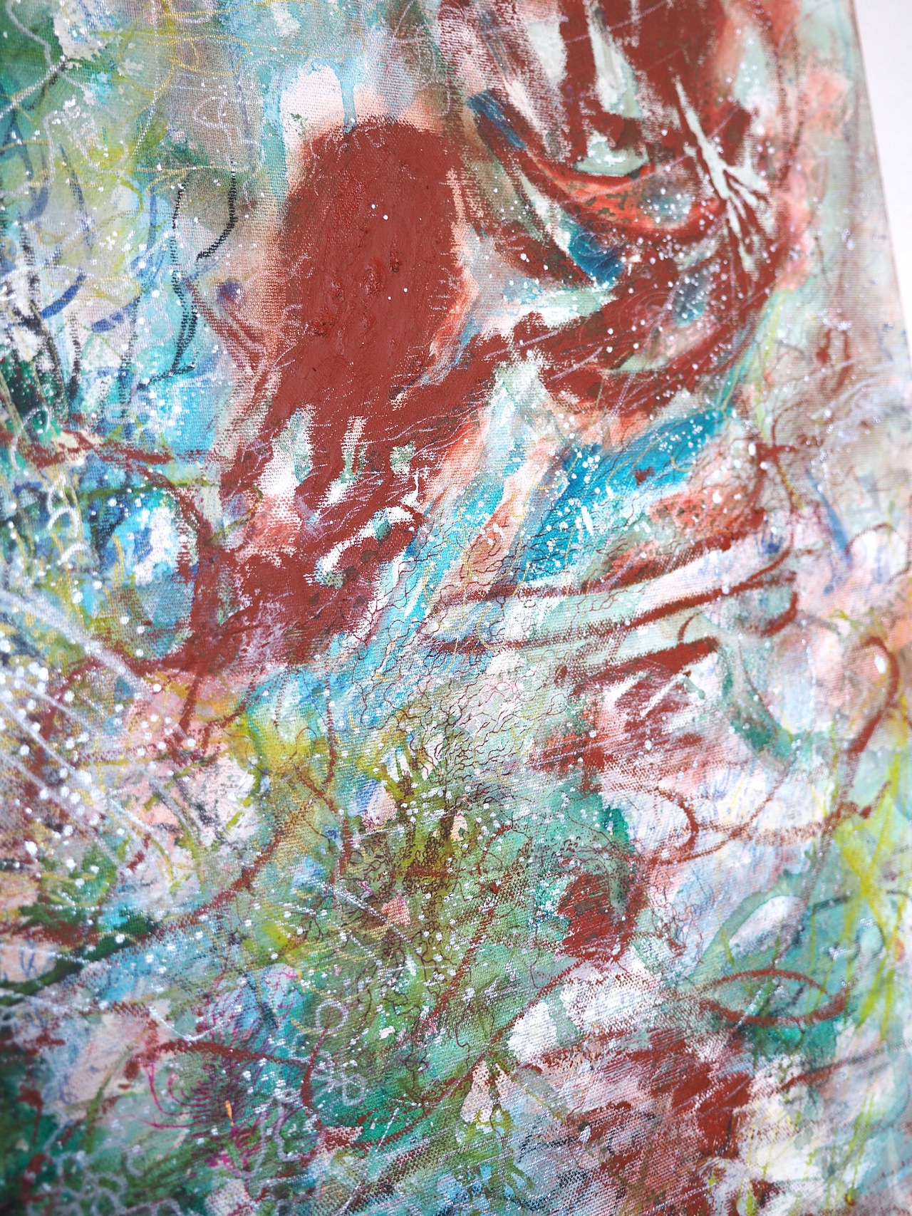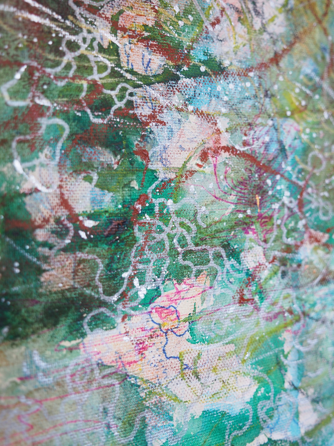 オイルスティック、油彩、ペン、オイルパステル、アクリル、アクリルガッシュ、ジェッソ、水彩色鉛筆、キャンバス