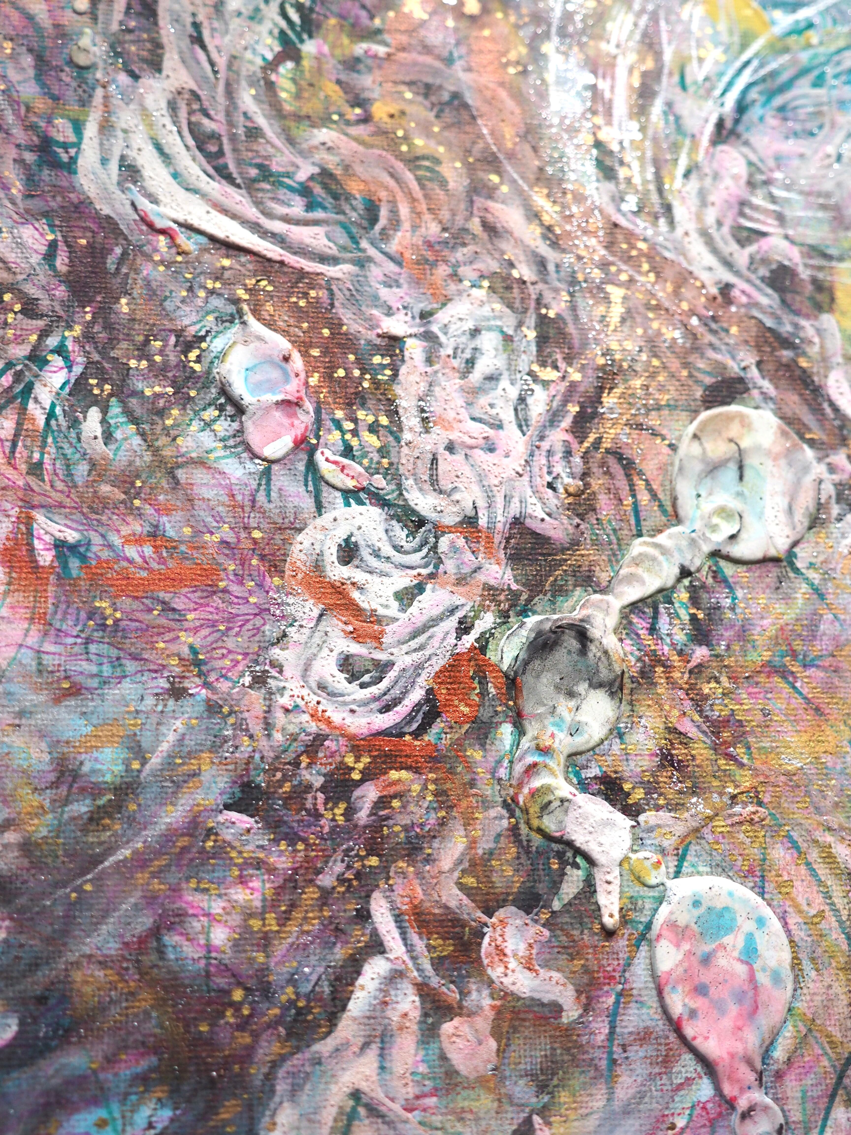 アクリルガッシュ、ペン、漆喰、水彩色鉛筆、墨、ジェッソ、キャンバスボード