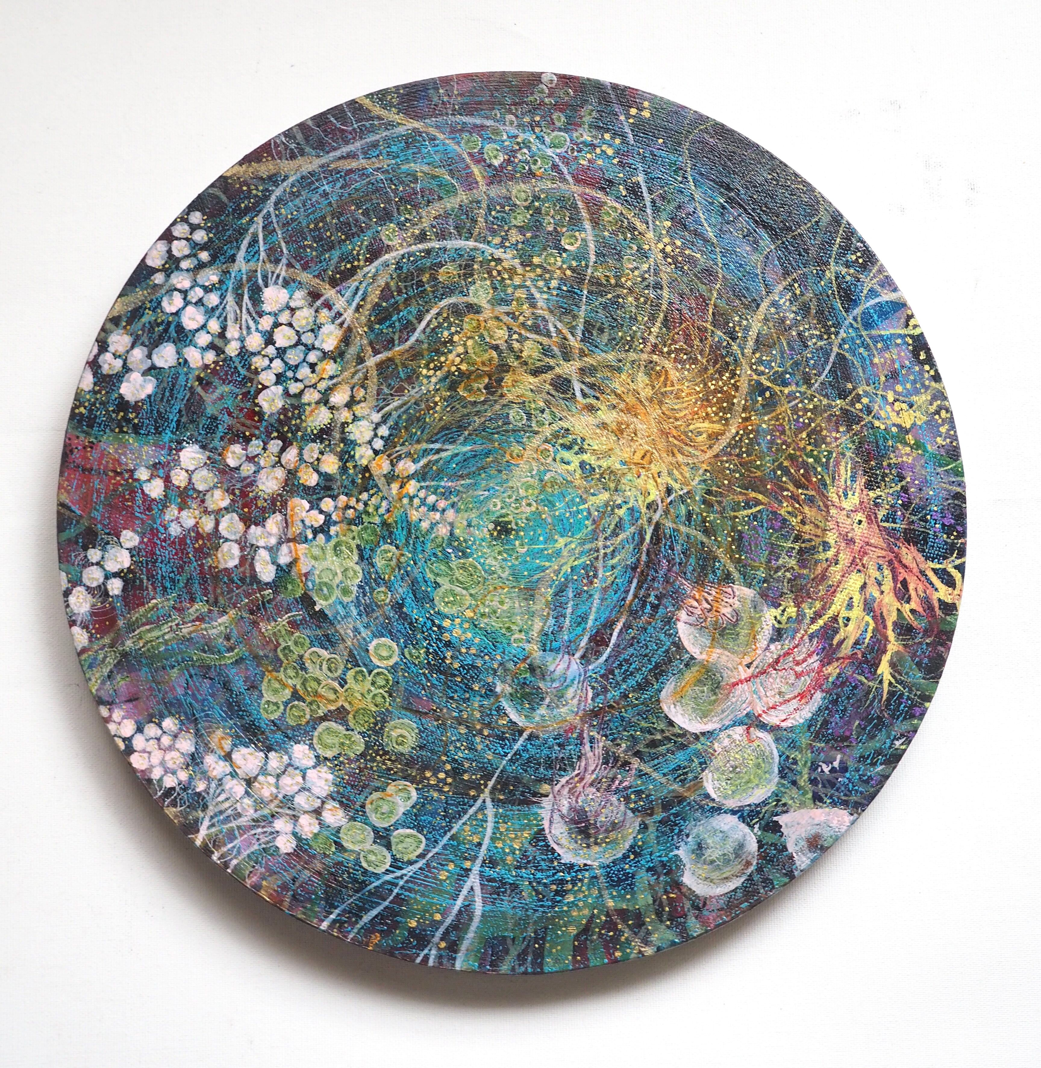 アクリルガッシュ、ペン、水彩色鉛筆、オイルパステル、キャンバス